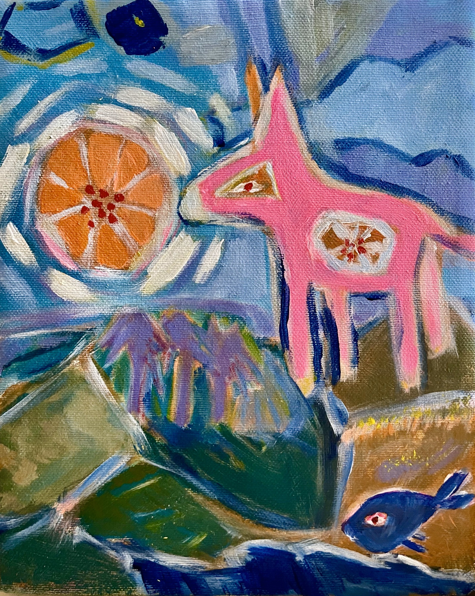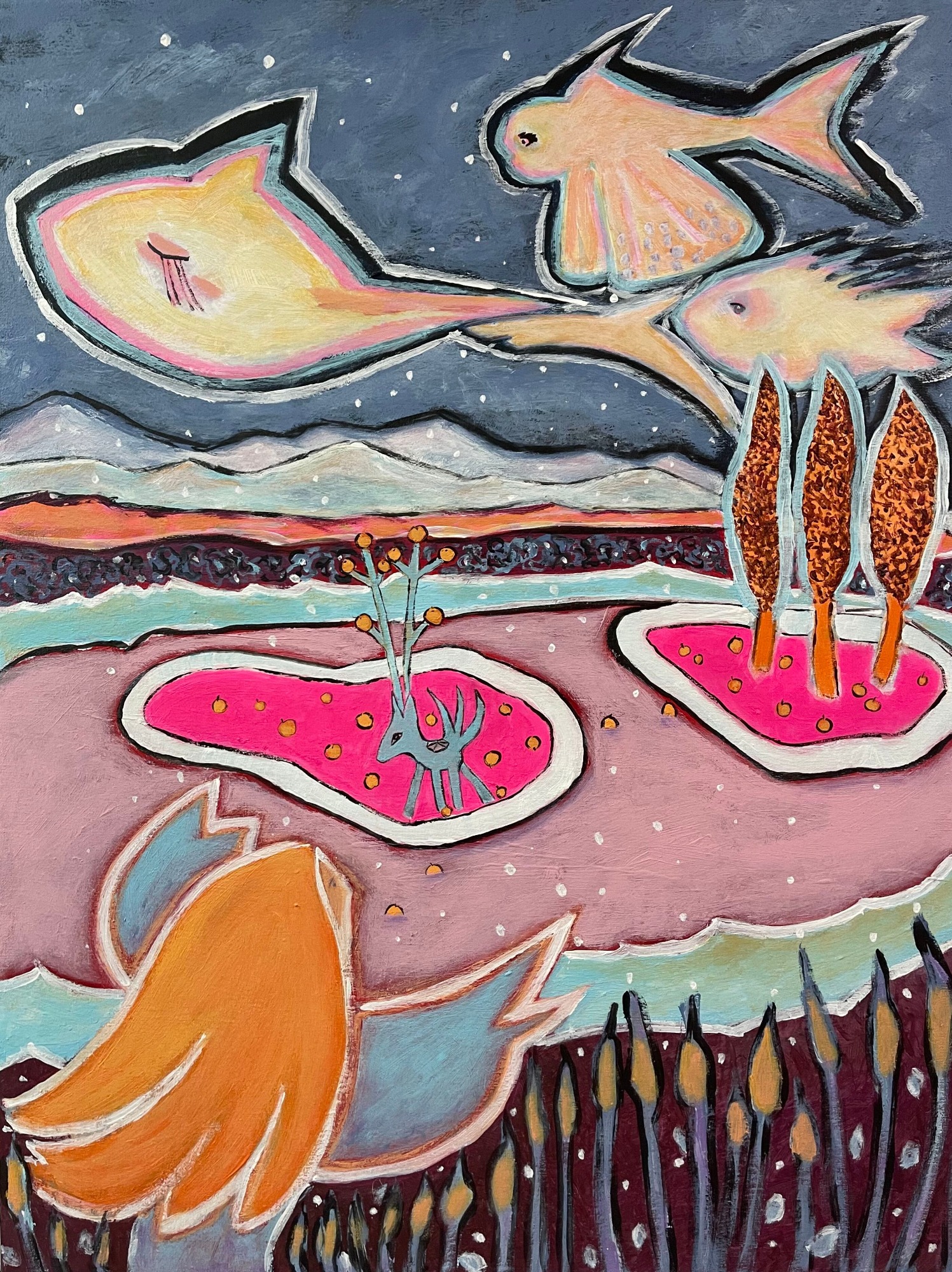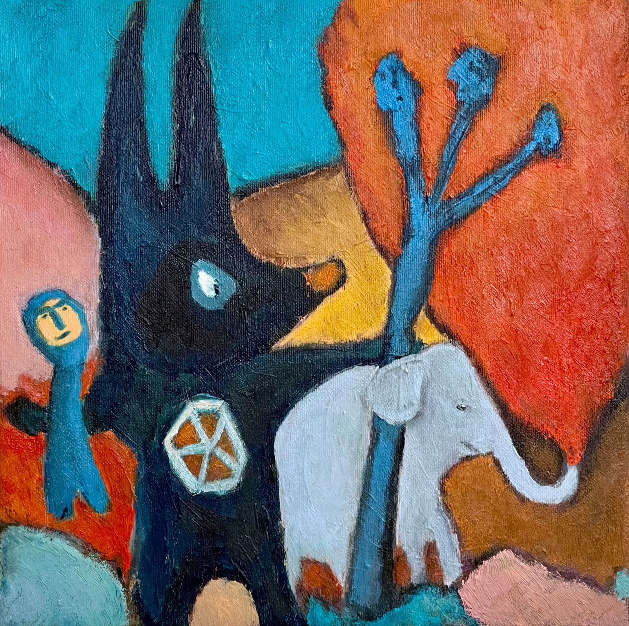 The Orangefox Series explores transformation through recurring figures. The Orangefox appears, transforms, and reappears across the canvas, guiding the viewer through a network of visual narratives. Each painting captures a moment within a larger, evolving system of myth, memory, and imaginative encounter.