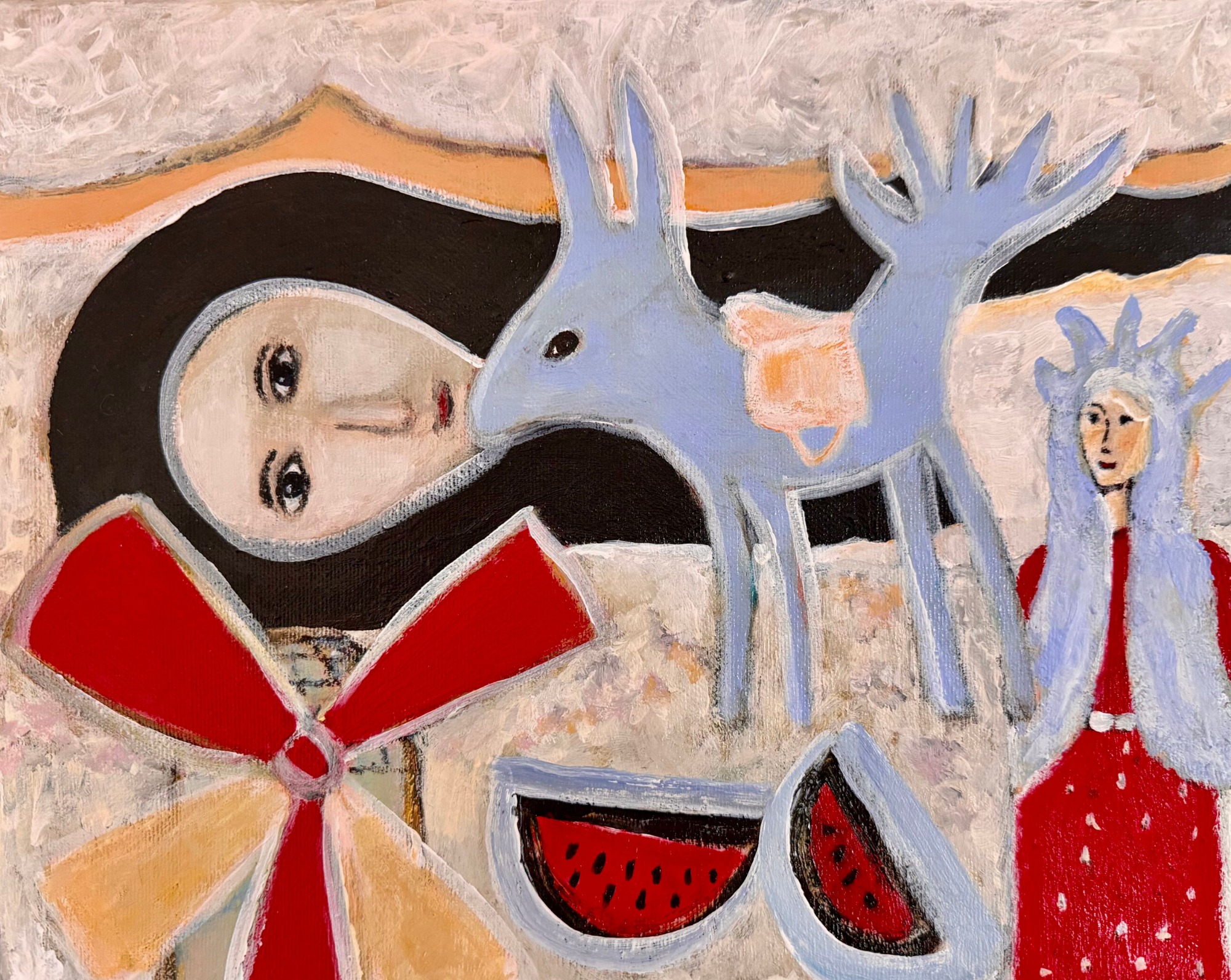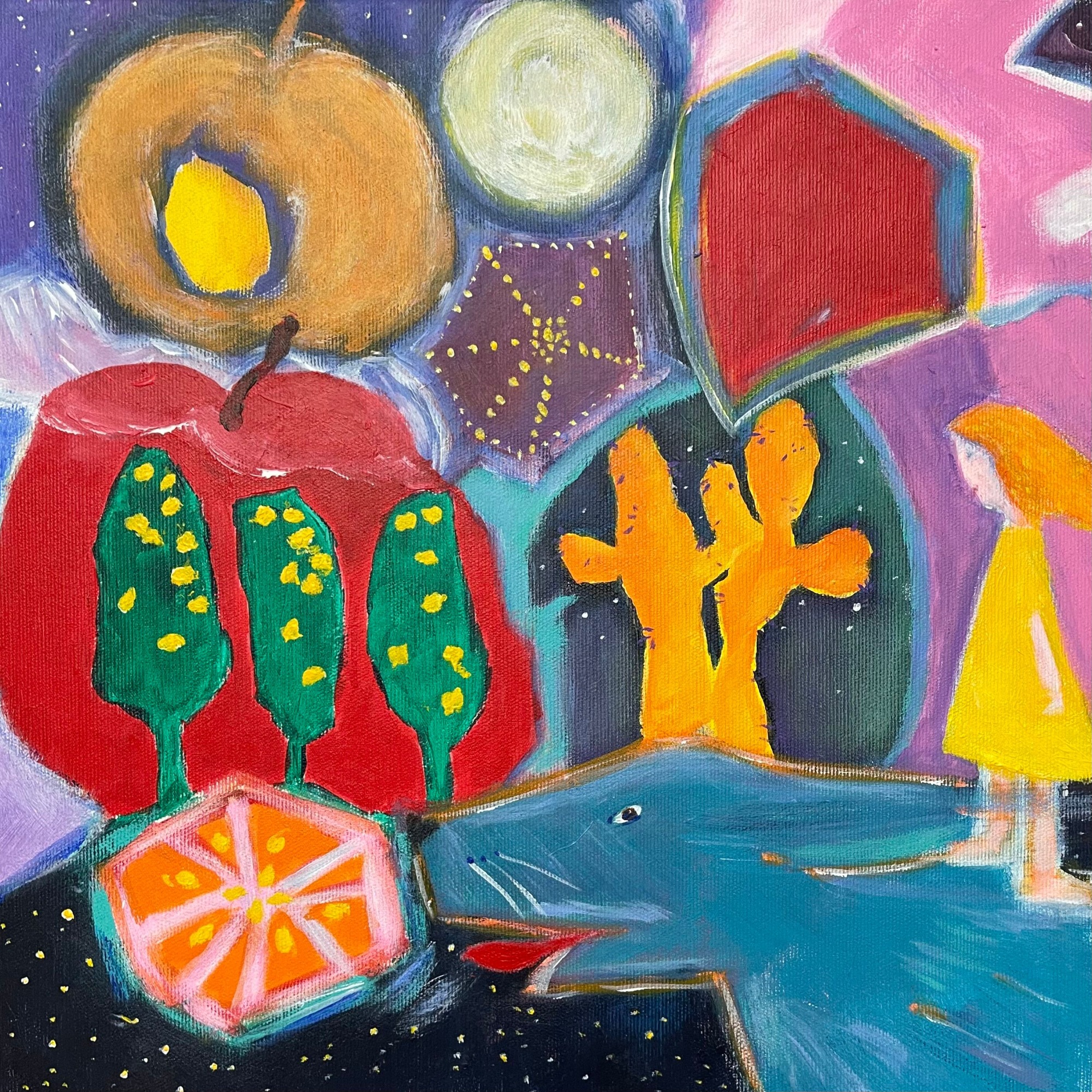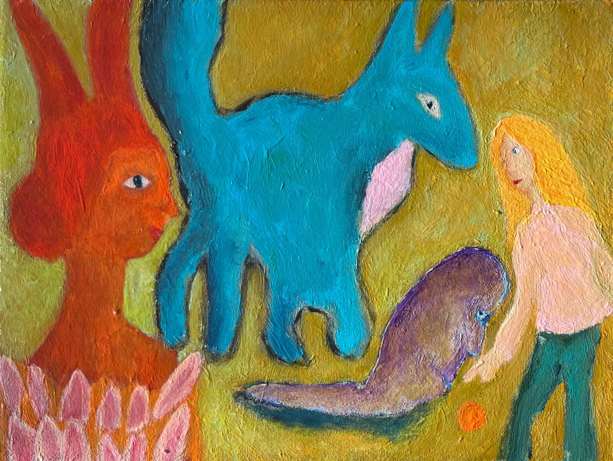The Orangefox Series explores transformation through recurring figures. The Orangefox appears, transforms, and reappears across the canvas, guiding the viewer through a network of visual narratives. Each painting captures a moment within a larger, evolving system of myth, memory, and imaginative encounter.